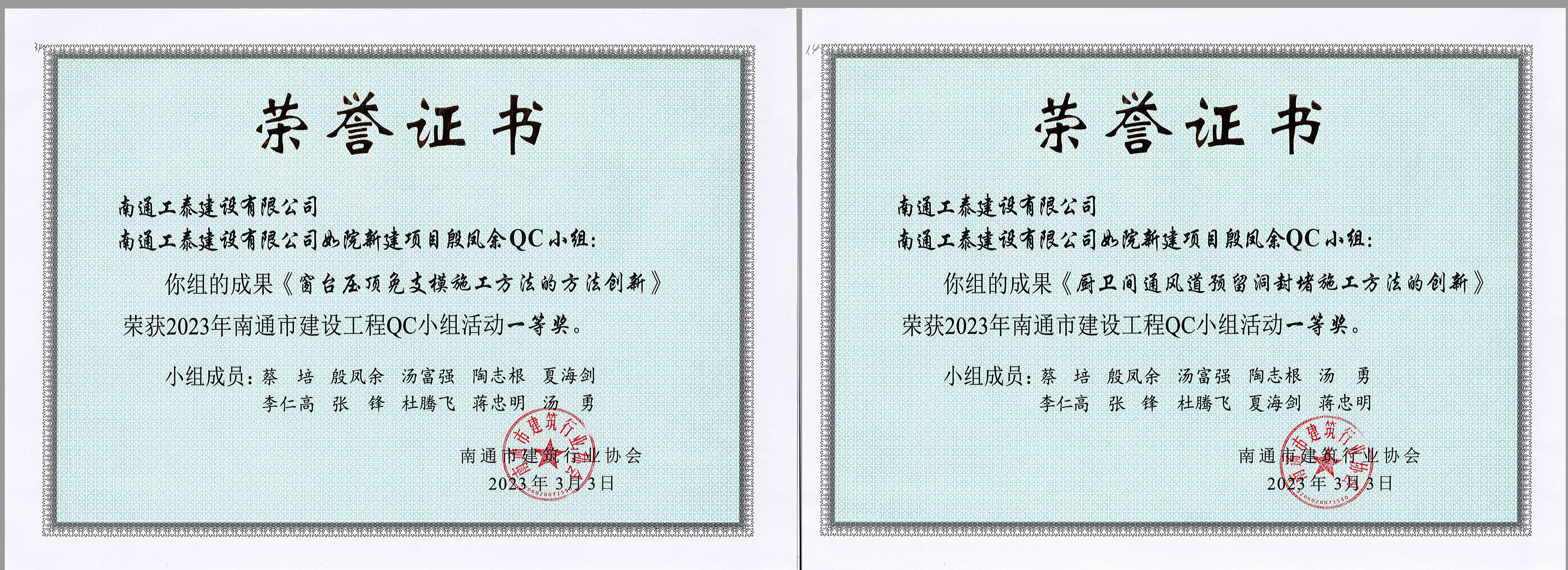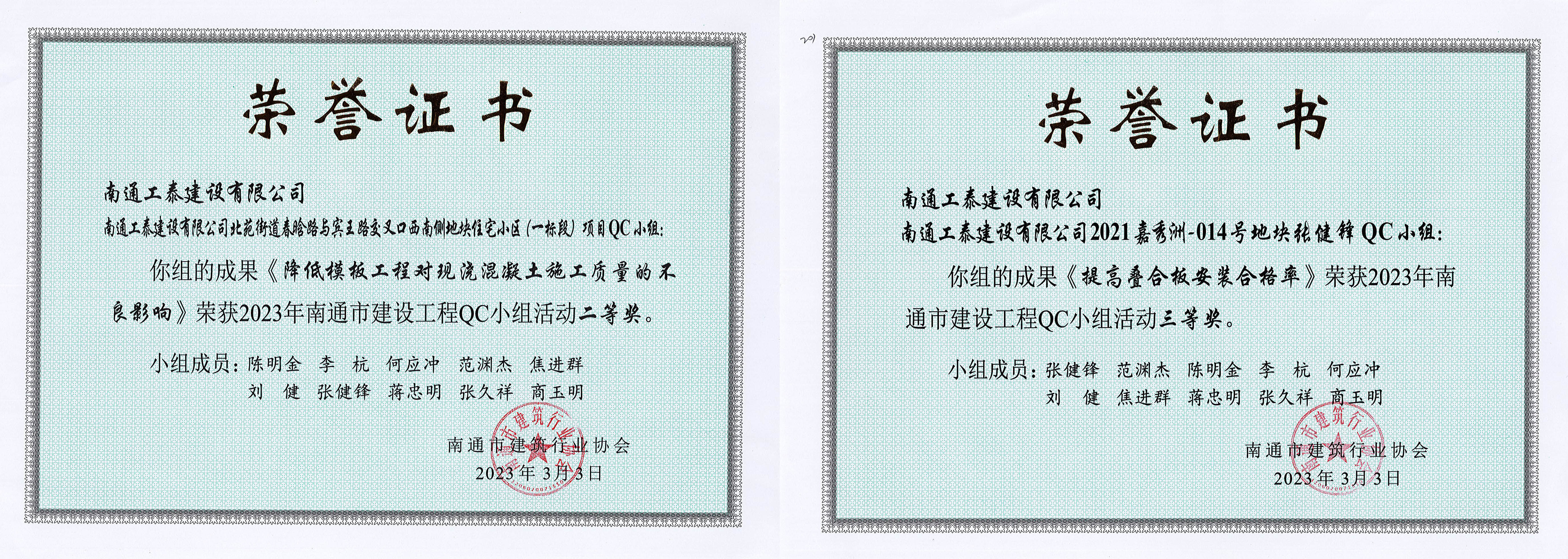 銀川分公司如院新建項(xiàng)目殷鳳余QC小組《廚衛(wèi)間通風(fēng)道預(yù)留洞封堵施工方法的創(chuàng)新》、《窗臺(tái)壓頂免支模施工方法的方法創(chuàng)新》榮獲南通市建設(shè)工程活動(dòng)成果一等獎(jiǎng);浙江分公司義烏項(xiàng)目部北苑街道春晗路與賓王路交叉路口西南側(cè)地塊住宅小區(qū)(一標(biāo)段)項(xiàng)目QC小組的《降低模板工程隊(duì)現(xiàn)澆混凝土施工質(zhì)量的不良影響》、2021嘉秀洲—014號(hào)地塊張建峰QC小組的《提高疊合板安裝合格率》榮獲南通市建設(shè)工程活動(dòng)成果二、三等獎(jiǎng)。